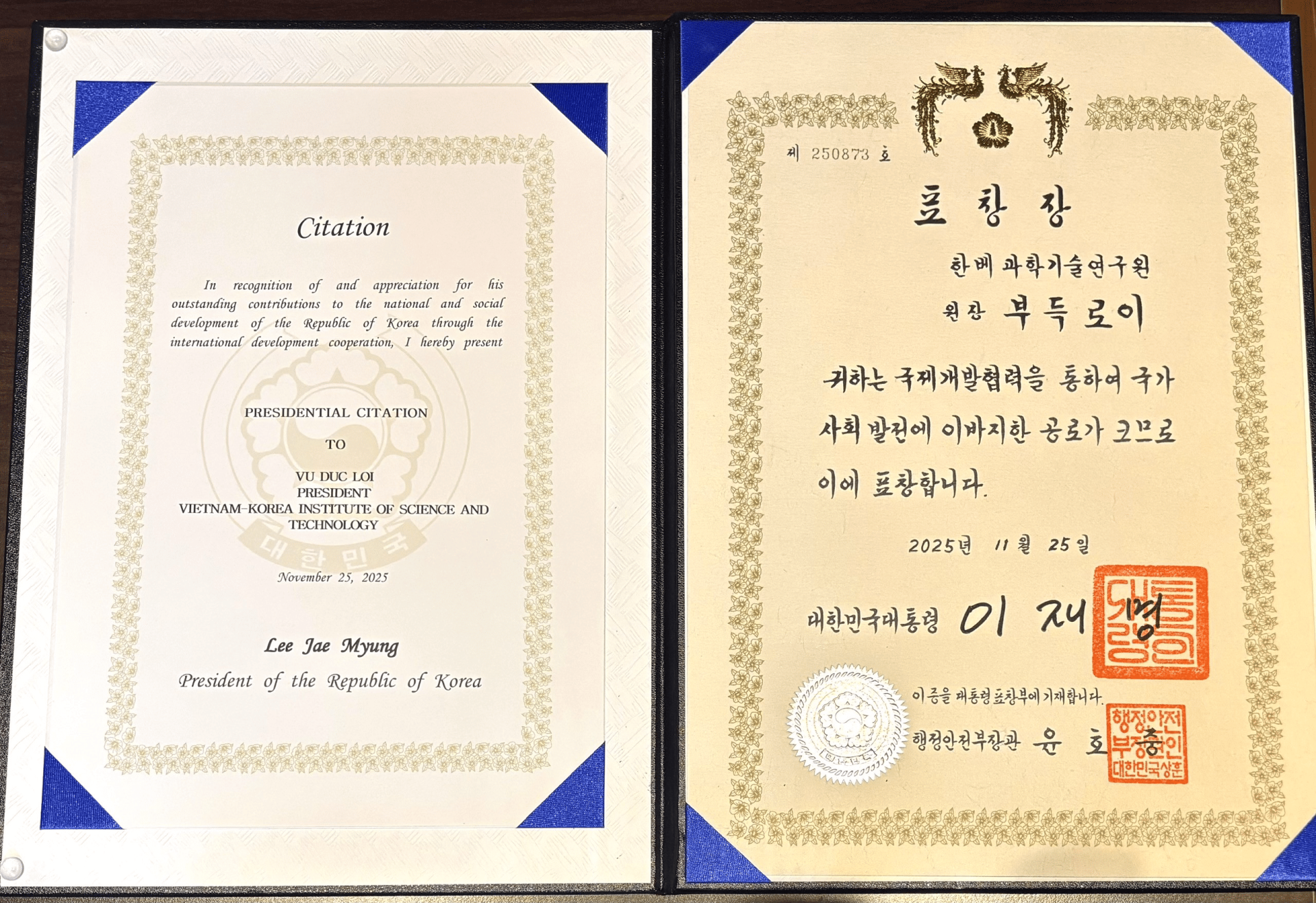 Huân chương danh giá này là sự ghi nhận của Chính phủ Hàn Quốc dành cho những nỗ lực bền bỉ, trách nhiệm và tâm huyết của PGS.TS. Vũ Đức Lợi trong suốt nhiều năm qua - đặc biệt trong vai trò triển khai và thúc đẩy mô hình hợp tác tiêu biểu giữa hai quốc gia tại Viện VKIST.