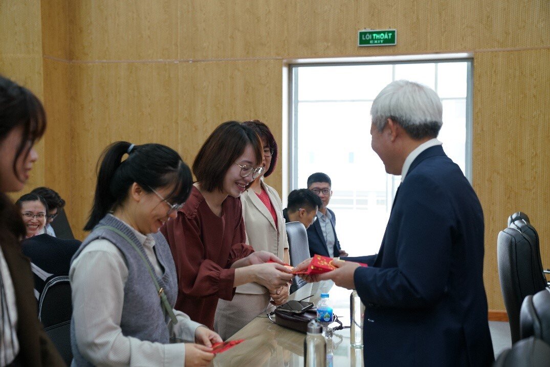 Trong không khí vui tươi, Thứ trưởng trao phong bao lì xì tới CBNV VKIST như lời chúc may mắn và khởi đầu thuận lợi cho năm mới.